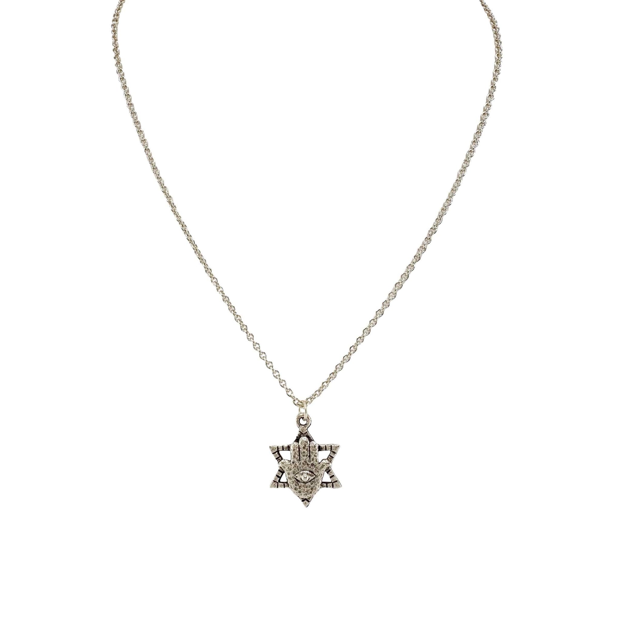 16" necklace with thin chain featuring Star of David and Hamsa charms. Symbolic design blends elegance and meaning.
