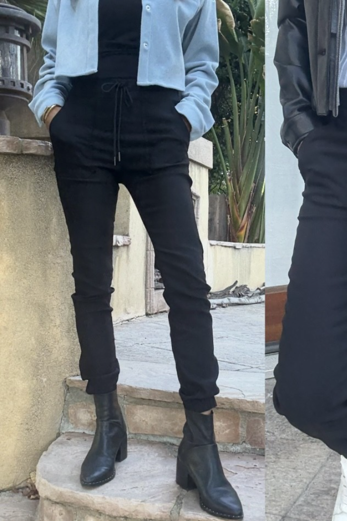 Tali Style Black with a tie and ribbed cuffs at the ankle. Machine washable. Does not Wrinkle or Fade. Comfortable, stylish, very flattering. Wear with sneakers, sandals, booties, or heels. Wear it Casual or Dressy for Evening. Try them and you will see why these pants have been the #1 selling item in boutiques all around the U.S. Inseam: 27", Rise: 10.5".