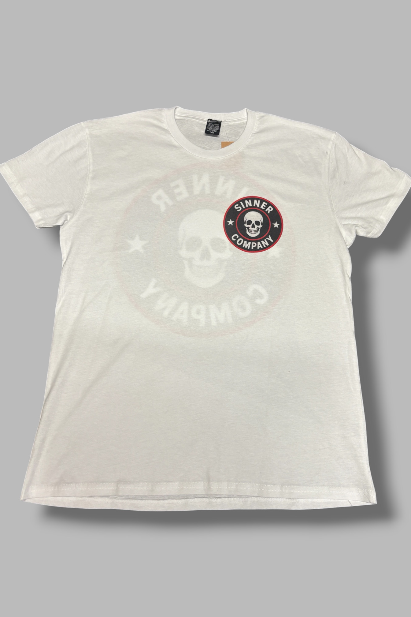 White graphic t-shirt featuring the "Sinner Company" circular logo with a while skull and red accents.