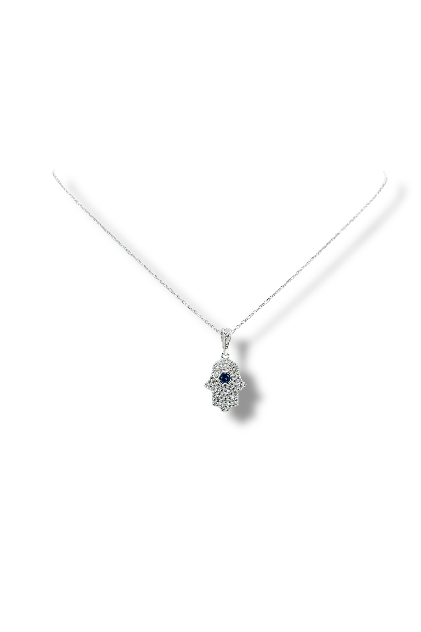 Add a touch of sophistication and protective charm to your jewelry collection with the 925 Sterling Silver Navy Stone Hamsa Necklace. This beautifully crafted piece combines luxurious materials with powerful symbolism, making it a standout accessory for any occasion. Key Features: • Elegant Hamsa Pendant: The necklace features a finely detailed Hamsa hand pendant, symbolizing protection and good fortune. The Hamsa is believed to ward off negative energies and bring blessings, adding both meaning and style to the piece. • Striking Navy Stone: The pendant is set with a rich navy stone, providing a deep, sophisticated hue that contrasts beautifully with the sterling silver. The navy stone adds a pop of color and enhances the necklace’s overall elegance. • Premium Sterling Silver: Crafted from 925 sterling silver, this necklace offers durability and a brilliant shine. The high-quality material ensures a timeless look and long-lasting wear.