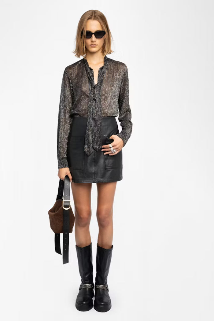 A shimmering tie-neck blouse cut in a relaxed, slightly sheer silhouette. The Tulba Shirt pairs a delicate metallic finish with a shirt-style neckline and long sleeves for polished evening wear. Zadig & Voltaire designed this piece to feel modern and a little edgy, perfect for night outs or elevated daytime looks. Tuck it into high-waist skirts or leather bottoms to heighten the rock-chic vibe.Description & details