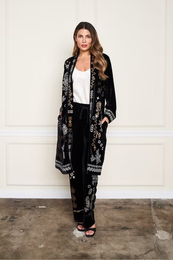 A luxe velvet duster trimmed with ornate embellishment, designed to layer over eveningwear or relaxed separates. The Velvet Embellished Duster features a long, open-front silhouette with roomy sleeves and practical pockets for effortless style. This piece is from Paparazzi by Biz and pairs well with coordinated velvet pants or simple basics for a polished, bohemian-glam look.